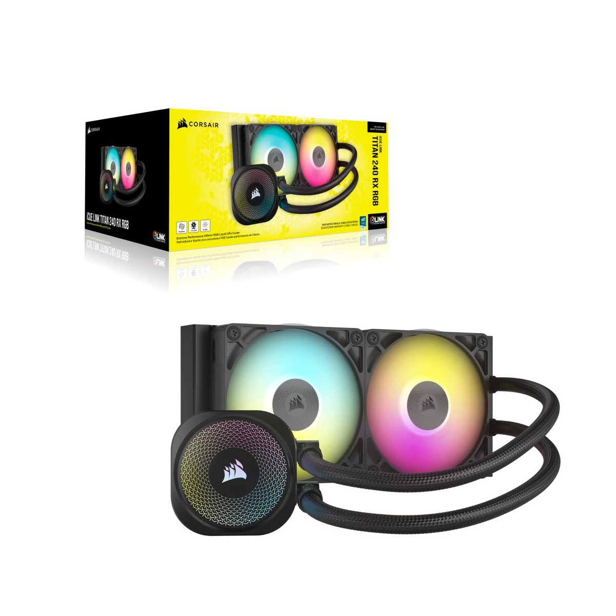 iCUE LINK TITAN 240 RX RGB AIO Liquid CPU Cooler The CORSAIR iCUE LINK TITAN RX RGB delivers powerful and quiet cooling with optimized thermal performance, simplified iCUE LINK connectivity, and dynamic RGB lighting. Includes Extreme cooling performance with