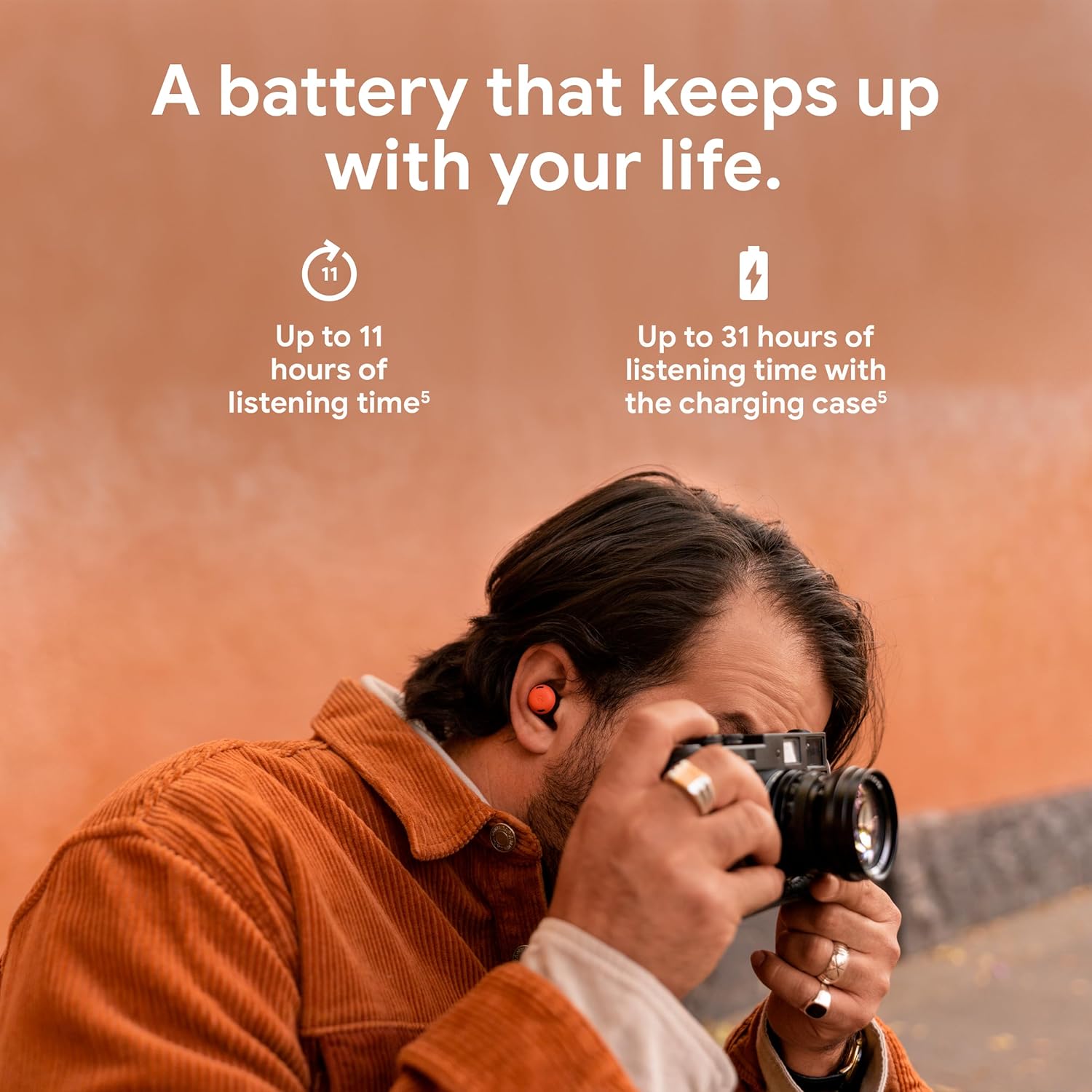 • Battery Life: 11 hours (earbuds), 31 hours with charging case
